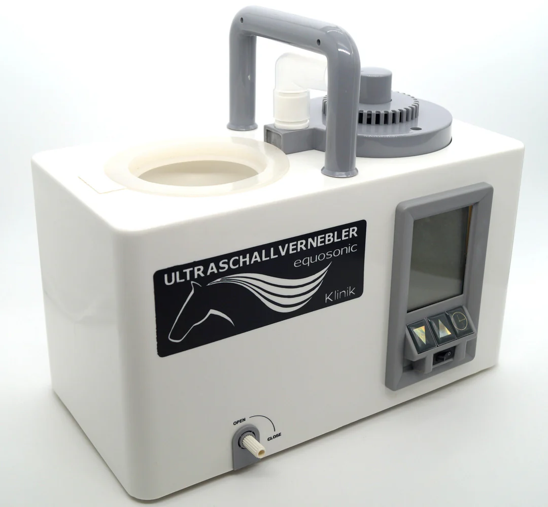 Unsere Ultraschallvernebler der Baureihe equosonic erreichen Tropfengrößen von 0,5 bis 5 µm, bei einer Leistung von bis zu 5,5 ml/Min. Für normal große Pferde sind 4 ml/Min völlig ausreichend. Sie erreichen sowohl die oberen als auch unteren Atemwege. Dies unterscheidet Ultraschallvernebler von den technisch einfacheren Kompressorverneblern, da der funktionale Hauptanteil der Atemwege mit seiner sehr großen Oberfläche (Bronchialsystem, Alveolarsystem der Lunge) voll erreicht wird.